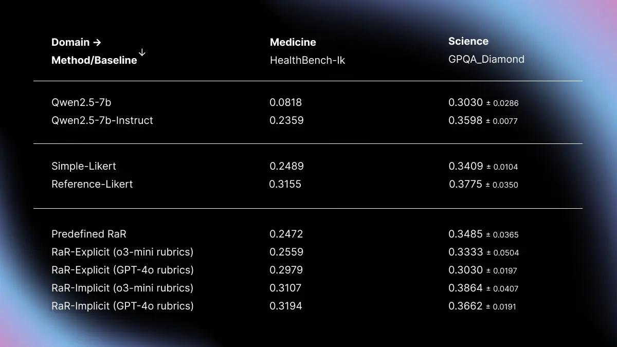 RaR provides a clear and substantial performance gain over existing post-training methods. The best-performing variant, RaR-Implicit, yielded up to a 28% relative improvement on OpenAI’s HealthBench-1k medical benchmark compared to baselines that use a Likert Score as reward. As shown in the table below, this represents the performance leap from a score of 0.2489 for the Simple-Likert baseline to 0.3194 for RaR-Implicit. The RaR method also matched or surpassed the performance of stronger baselines which use expert written reference answers to generate rewards for evaluation across medicine and science domains.