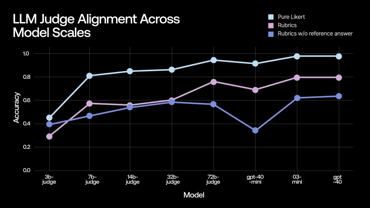The research also shows that rubrics make AI judges significantly more efficient. By providing a structured rubric, a smaller, more cost-effective judge model can evaluate responses with an accuracy that rivals its much larger counterparts. This effect is clearly visible in the LLM Judge Alignment graph, where the orange "Rubrics" line remains high and stable even for the smallest models, while the blue "Pure Likert" line struggles. This highlights a tangible path toward more scalable and cost-effective AI training and alignment, a major benefit for enterprise applications.