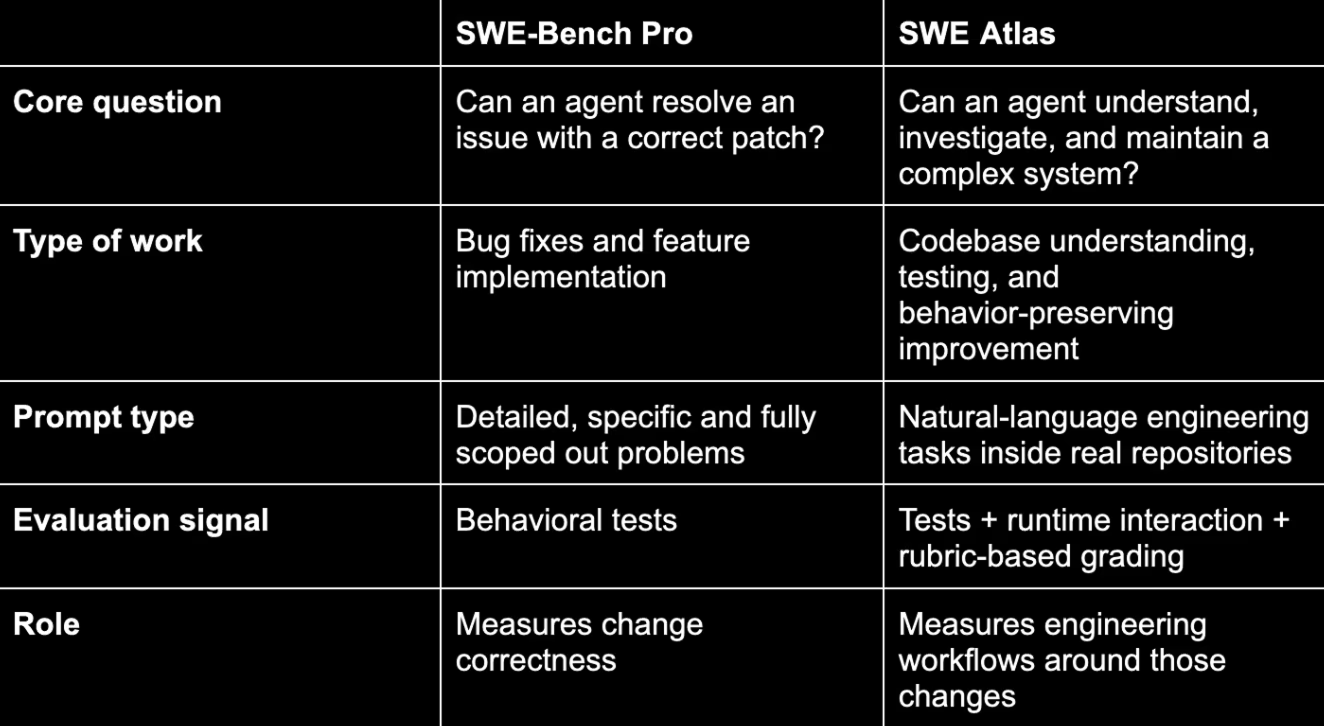 SWE Atlas builds on the foundation of Scale’s SWE-Bench Pro (recommended by OpenAI for frontier releases), drawing from the same production repos and environments while expanding evaluation to investigative and maintenance workflows.