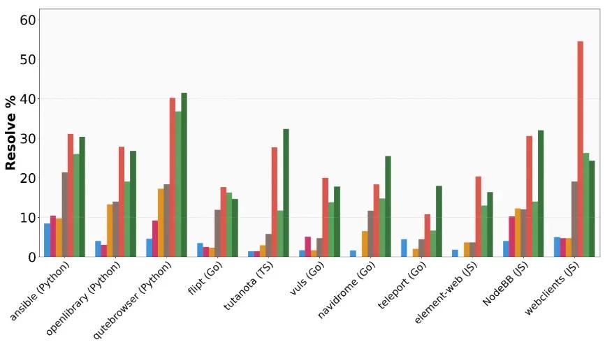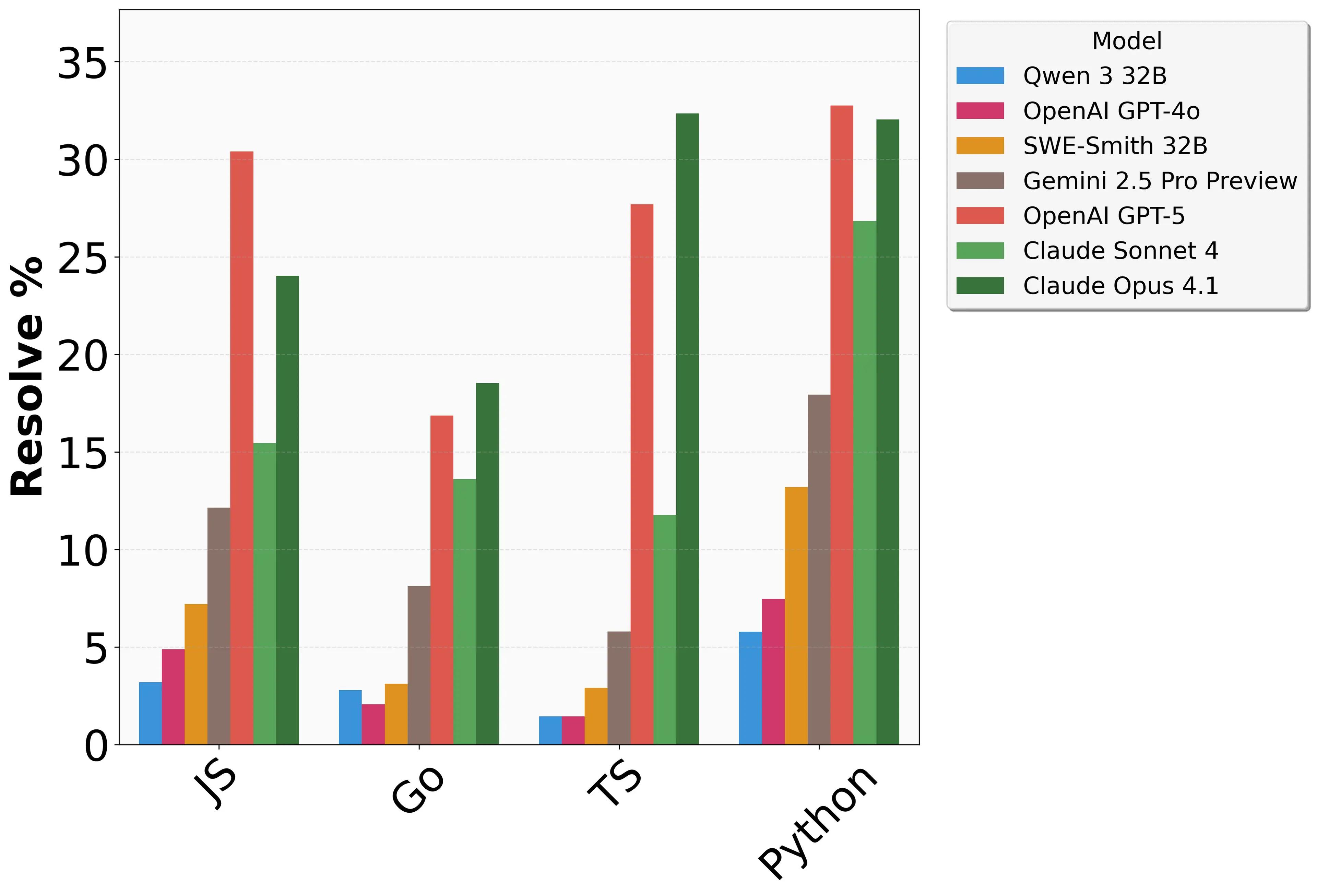 Performance Varies by Programming Language: Models show different success rates depending on the programming language. Go and Python tasks generally have higher resolution rates, with some models exceeding 30%. In contrast, performance on JavaScript (JS) and TypeScript (TS) is more varied and often lower, with rates ranging from almost 0% to over 30% depending on the specific model.