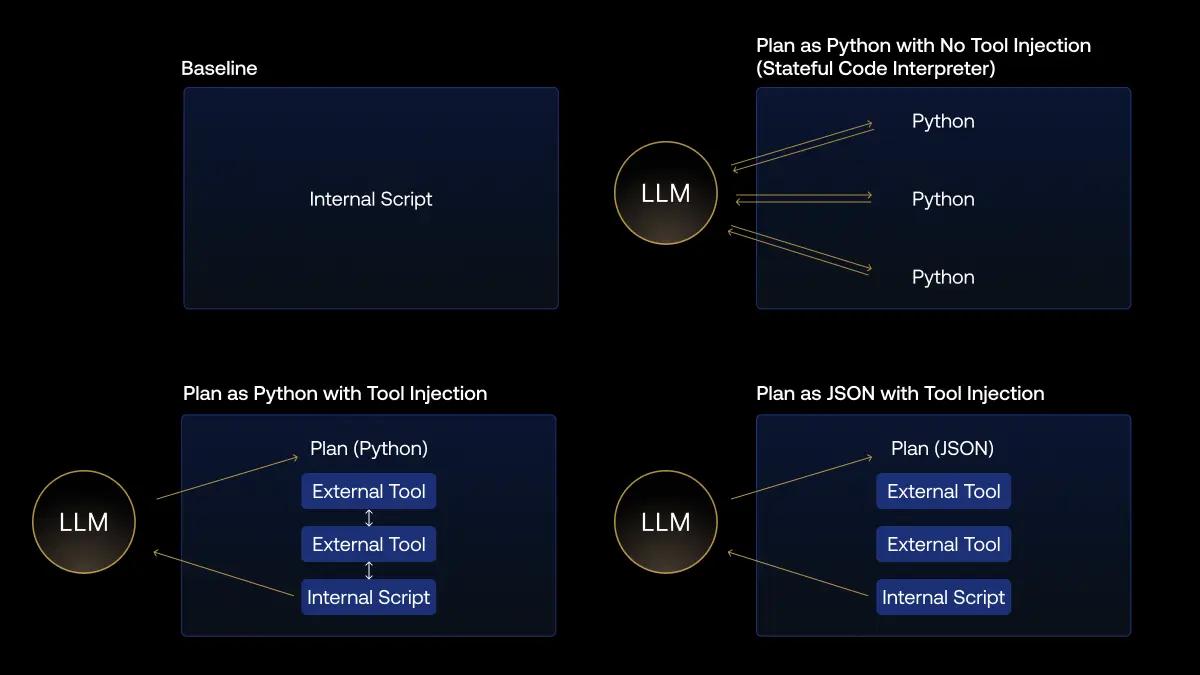 Having established the need for a plan, the question then becomes what format this plan should take. We explored three options: Plan as Python with no tool injection, Plan as JSON, and Plan as Python with tool injection. We tested these three options against a baseline, handwritten set of custom parsing scripts.