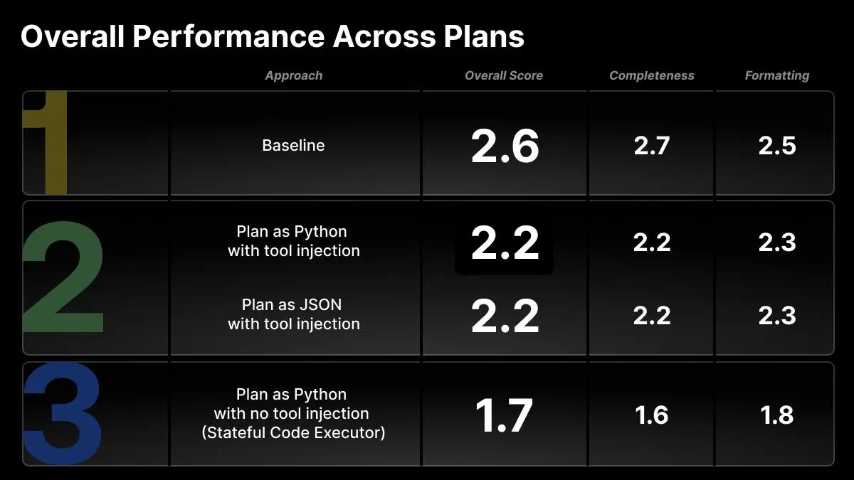 We take our findings from experiments like the one we share in today’s blog and codify them into our MLE tool suites so they can immediately put the results into practice and meaningfully improve delivery for our enterprise clients. In the case of the following experiment, we developed a PlanByPythonExecutor tool that is already being used in production.