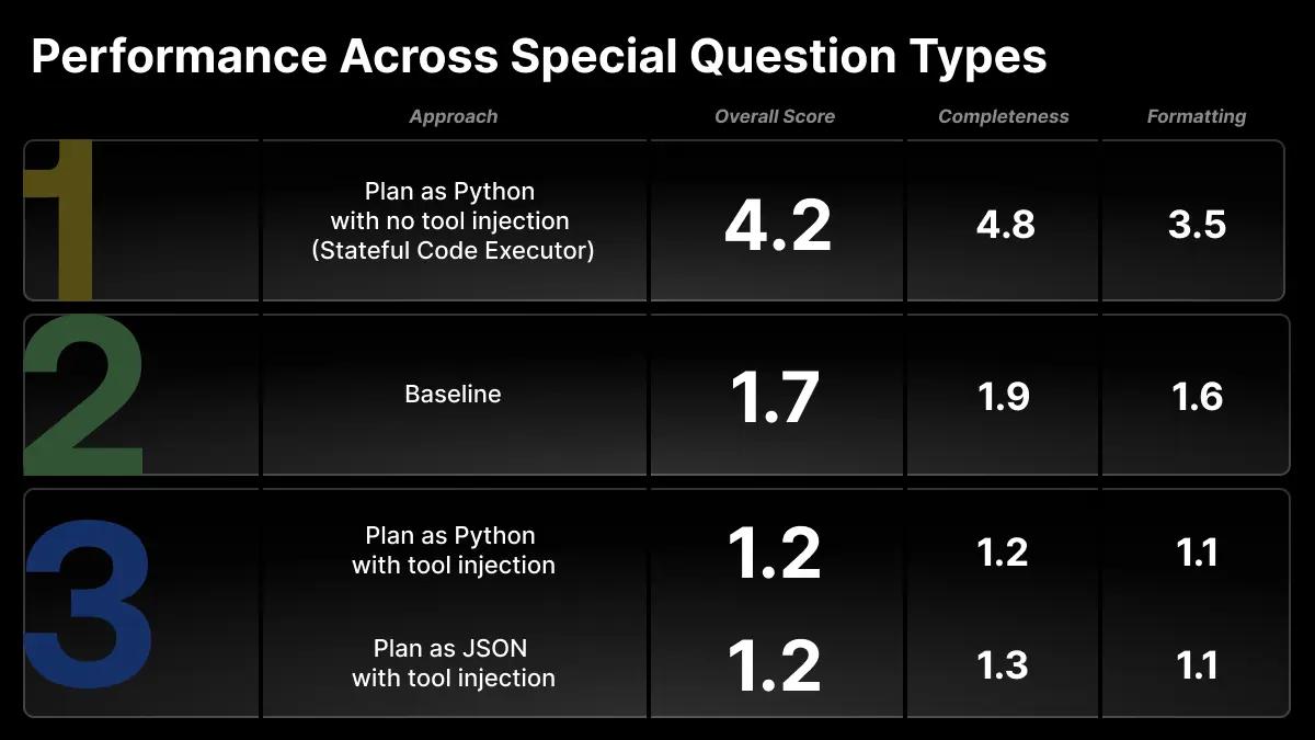 The Plan as Python (aka Code Interpreter Tool) which didn’t have access to our handwritten parsing functions overall performed slightly worse in our LLM-as-a-judge evaluations. Interestingly however, the LLM ended up implementing a completely new formatter for a question type we had not previously identified and significantly improved the quality of the question-answer parsing as a result. Thus, we show that overall the Code Interpreter Tool was inferior in our internal LLM-as-a-judge evaluations but for certain question types, it significantly outperformed all other approaches.