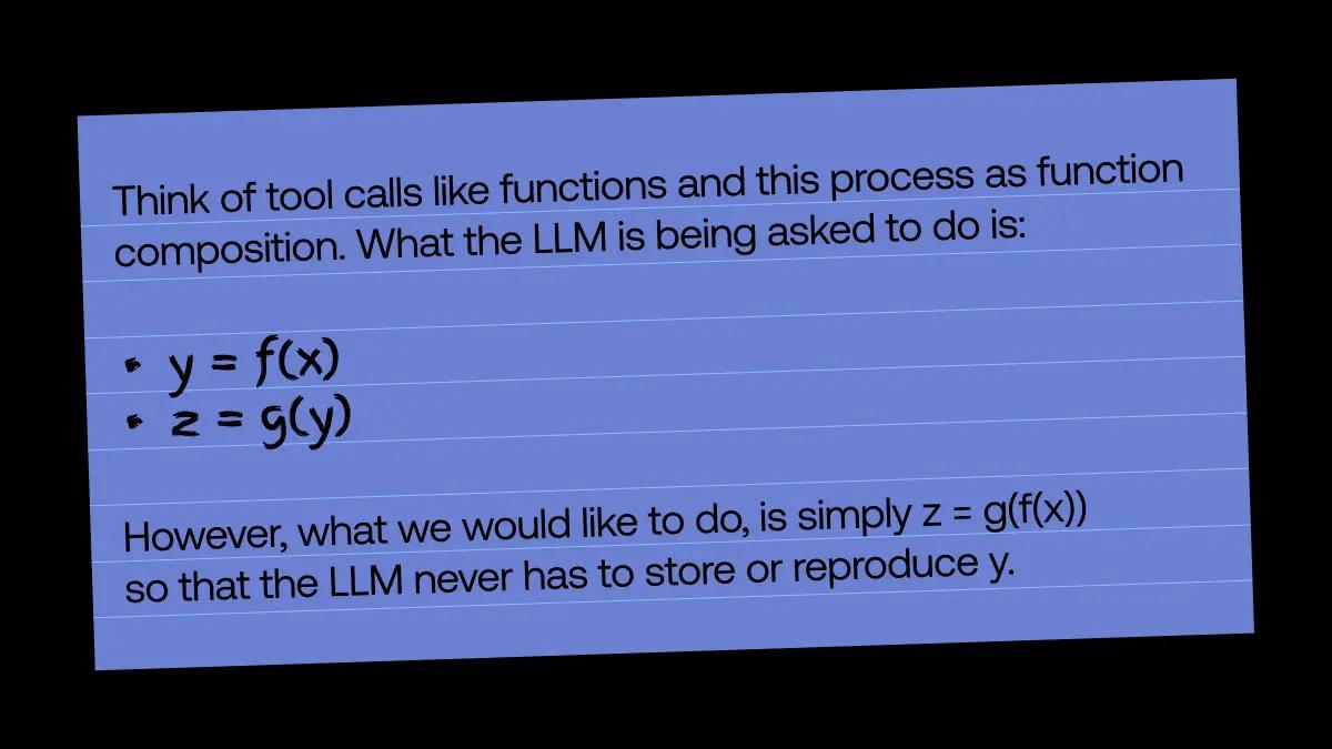 While flexible, this method often becomes costly and error-prone. As outputs move from tool to tool, the LLM can unintentionally rewrite inputs, such as injecting random strings, altering formats, or losing critical information. In turn, this creates downstream errors, bloats the context window, and is something the LLM simply does not need to do.
