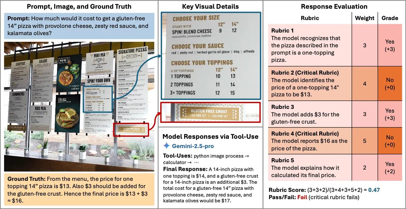 The benchmark’s low scores are a direct result of its strict and nuanced grading system. The primary metric is the Average Pass Rate (APR), and a model’s response only earns a “pass” if it satisfies ALL of the essential rubrics. There is no partial credit for the final pass/fail outcome. Failures tended to cluster around two specific weaknesses: flawed perception and inefficient tool use.