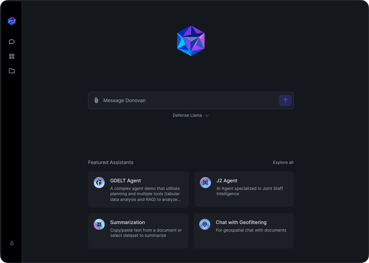 Deploy mission-tailored AI agents from concept to combat in record time with Donovan. Put advanced AI capabilities in the hands of warfighters when and where they need it most.