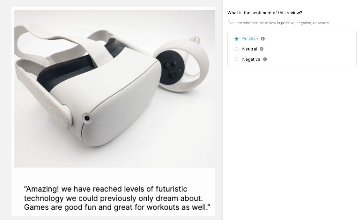 - Identify which modalities are best suited for your application. For instance, if you are working on sentiment analysis for AR/VR applications, you will want to consider not only 2D video object or human keypoint labels but also audio transcription and entity recognition in addition to sentiment classification so that you have a rich understanding of the entire scene and how the individuals in the scene contribute towards a particular sentiment (i.e., if the person is yelling and gesturing wildly you can determine the sentiment is "upset").