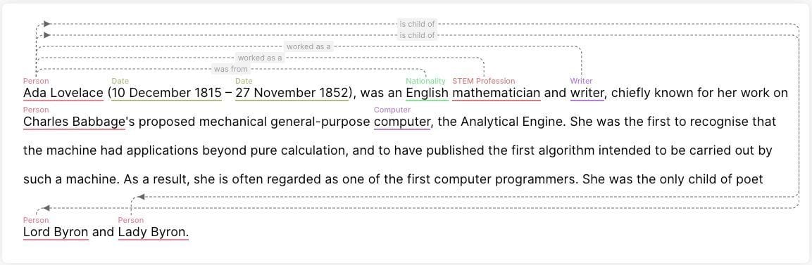 Named Entity recognition is similar to speech tagging but focuses on classifying text into predefined categories such as person names, organizations, locations, and time expressions. Linking entities to establish contextual relationships (i.e., Ada Lovelace is the child of Lord and Lady Byron) adds another layer of depth to your model's understanding of the text.