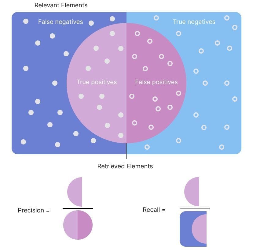 A model with high recall but low precision returns many results, but many of the predicted labels are incorrect compared to the ground truth labels. On the other hand, a model with high precision but low recall is just the opposite, returning very few results, but most of its predicted labels are correct when compared to the ground truth labels. An ideal model with high precision and high recall will return many results, with all results labeled correctly.